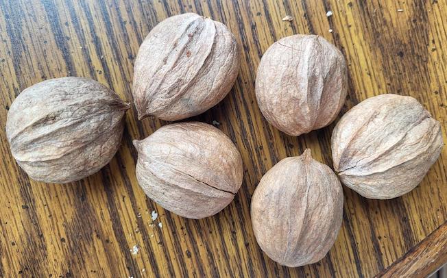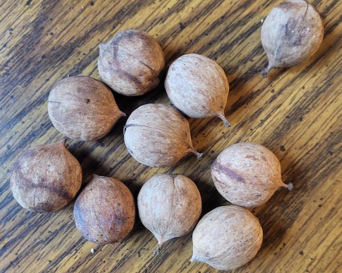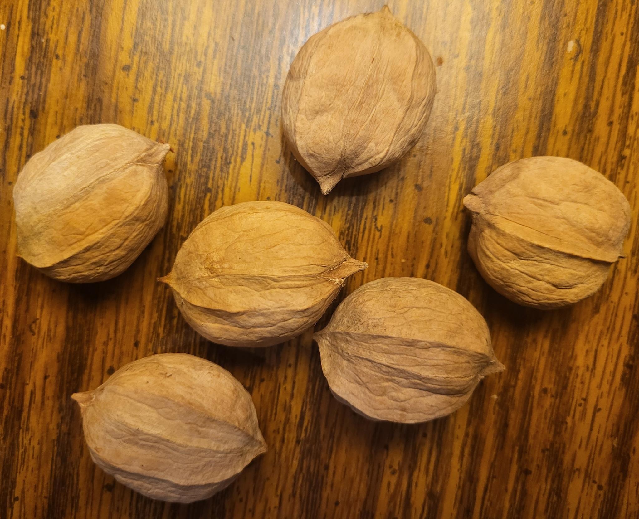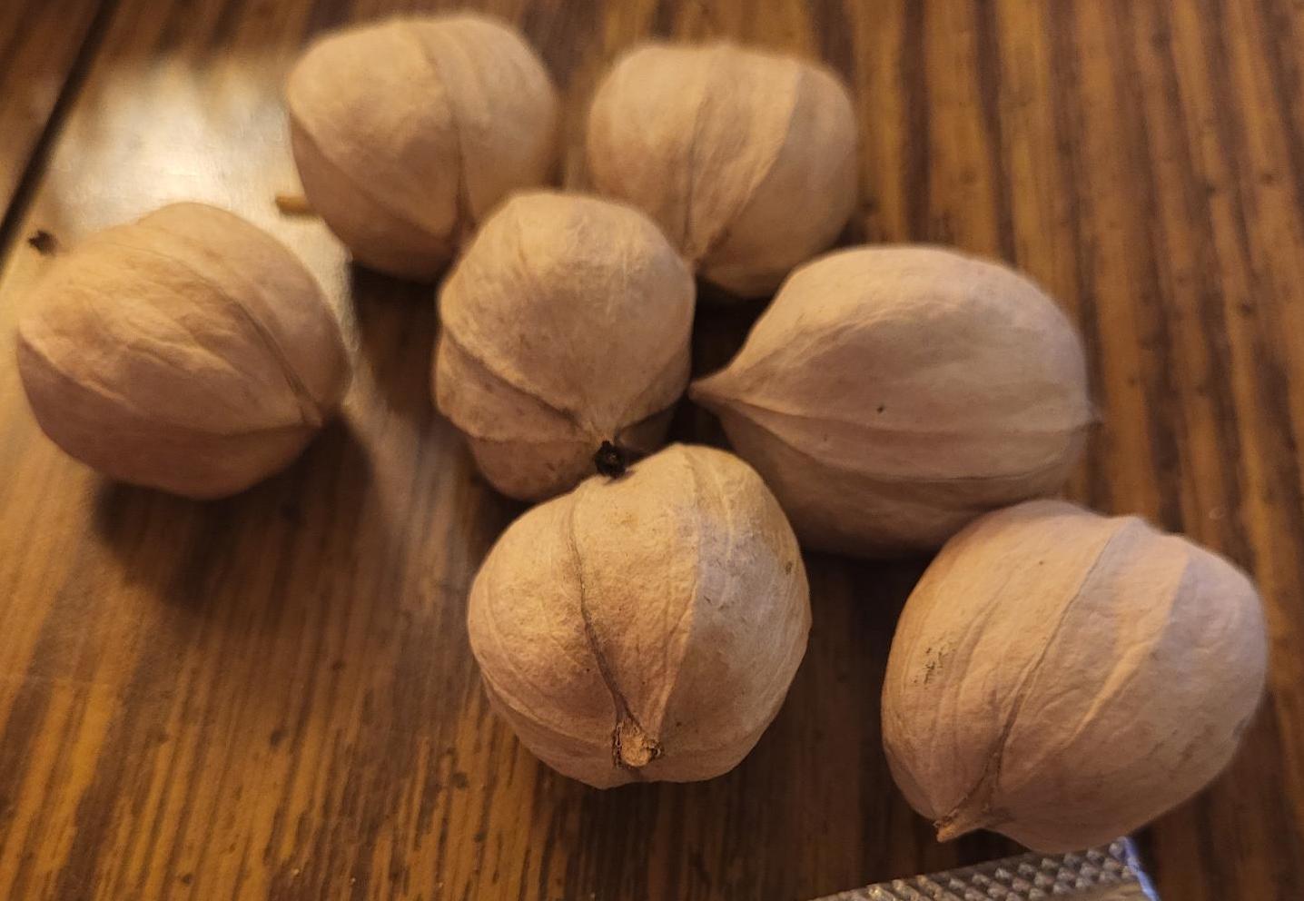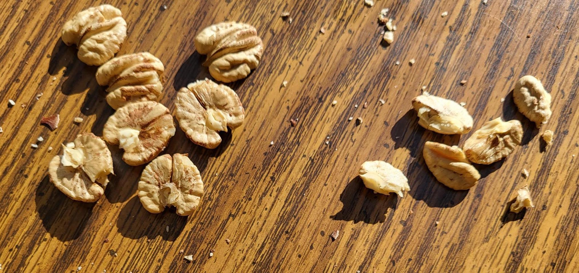 - "Paradise" - Mostly Bitternut. 3.4-4.0g kernel, 56% kernel, 20% halves, 50% quarters, 30% pieces, 70% finger extraction. Okay extraction with some shell pieces holding in large kernel pieces. 13/17 nuts were healthy in the sample provided in March. 1 had weevil, 3 were rancid. Low astringency - less than skyview. Sweet bitshag flavor like fairbanks but with astringency. Likely pollen sterile. Lateral bearing. Annual heavy bearer. Recorded yield around 200 gal in husk. PA.