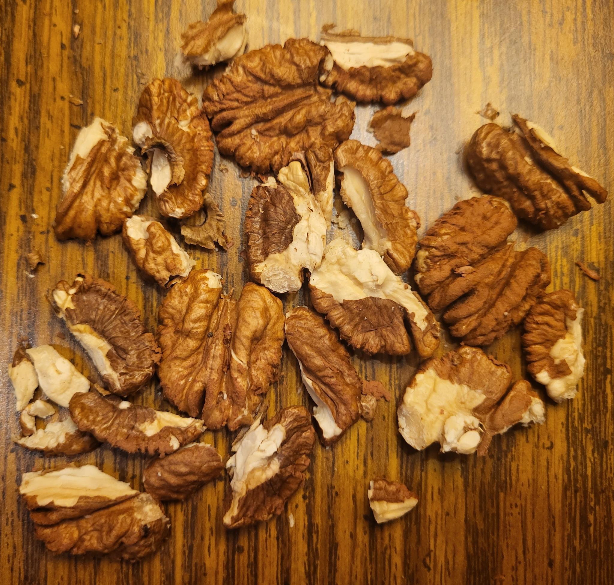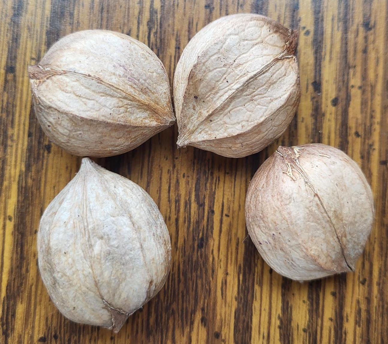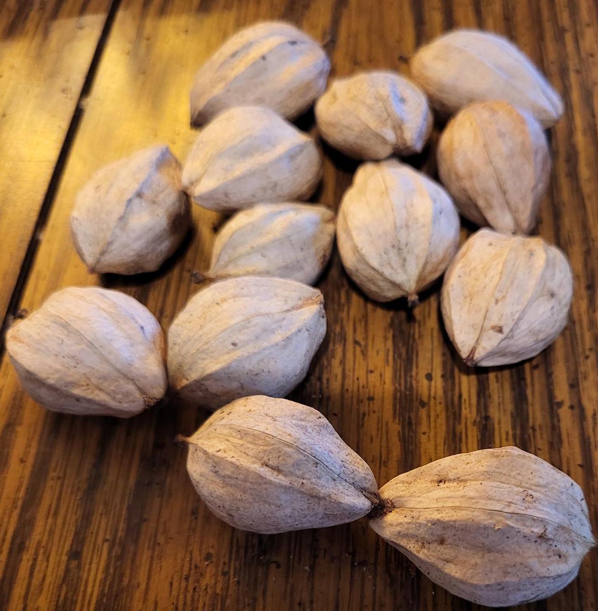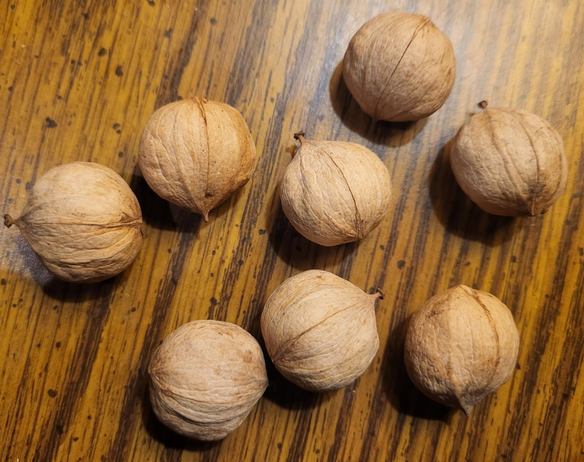 - "Paradise" - Mostly Bitternut. 3.4-4.0g kernel, 56% kernel, 20% halves, 50% quarters, 30% pieces, 70% finger extraction. Okay extraction with some shell pieces holding in large kernel pieces. 13/17 nuts were healthy in the sample provided in March. 1 had weevil, 3 were rancid. Low astringency - less than skyview. Sweet bitshag flavor like fairbanks but with astringency. Likely pollen sterile. Lateral bearing. Annual heavy bearer. Recorded yield around 200 gal in husk. PA.