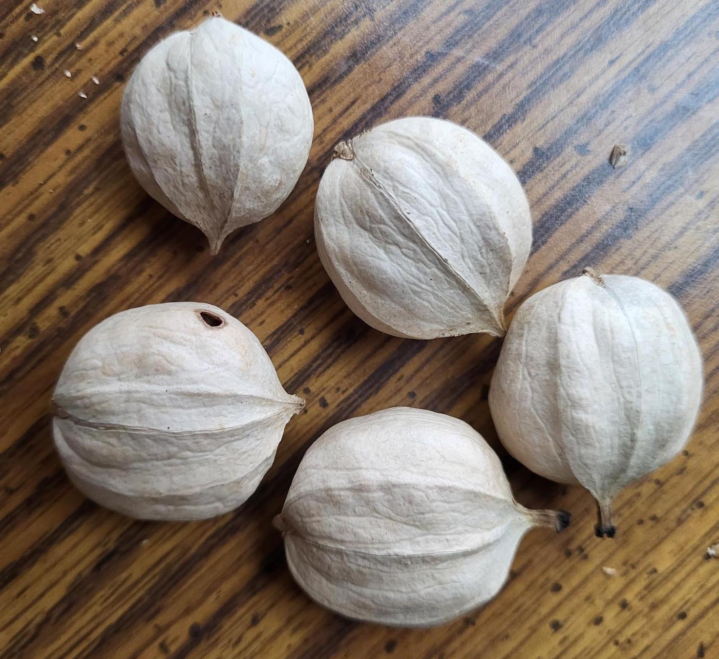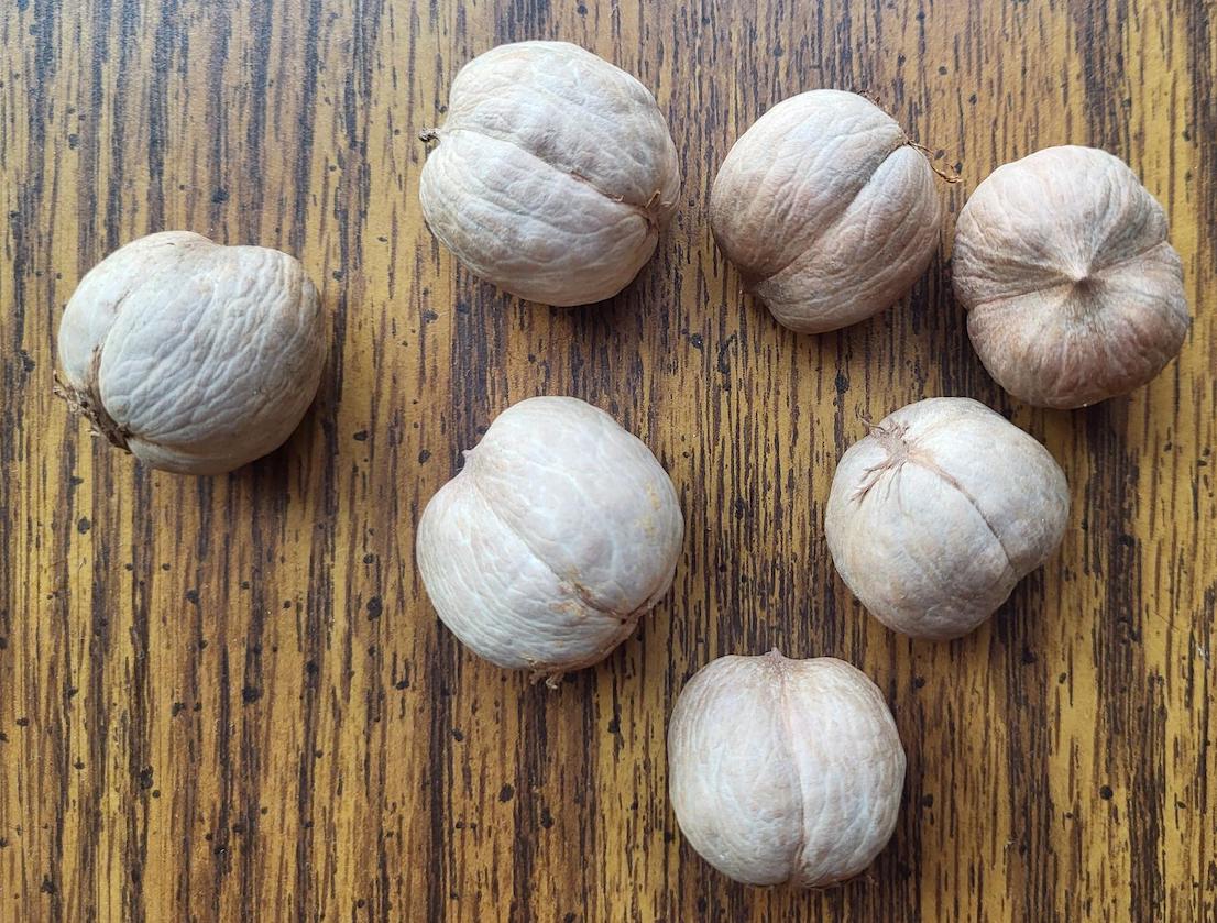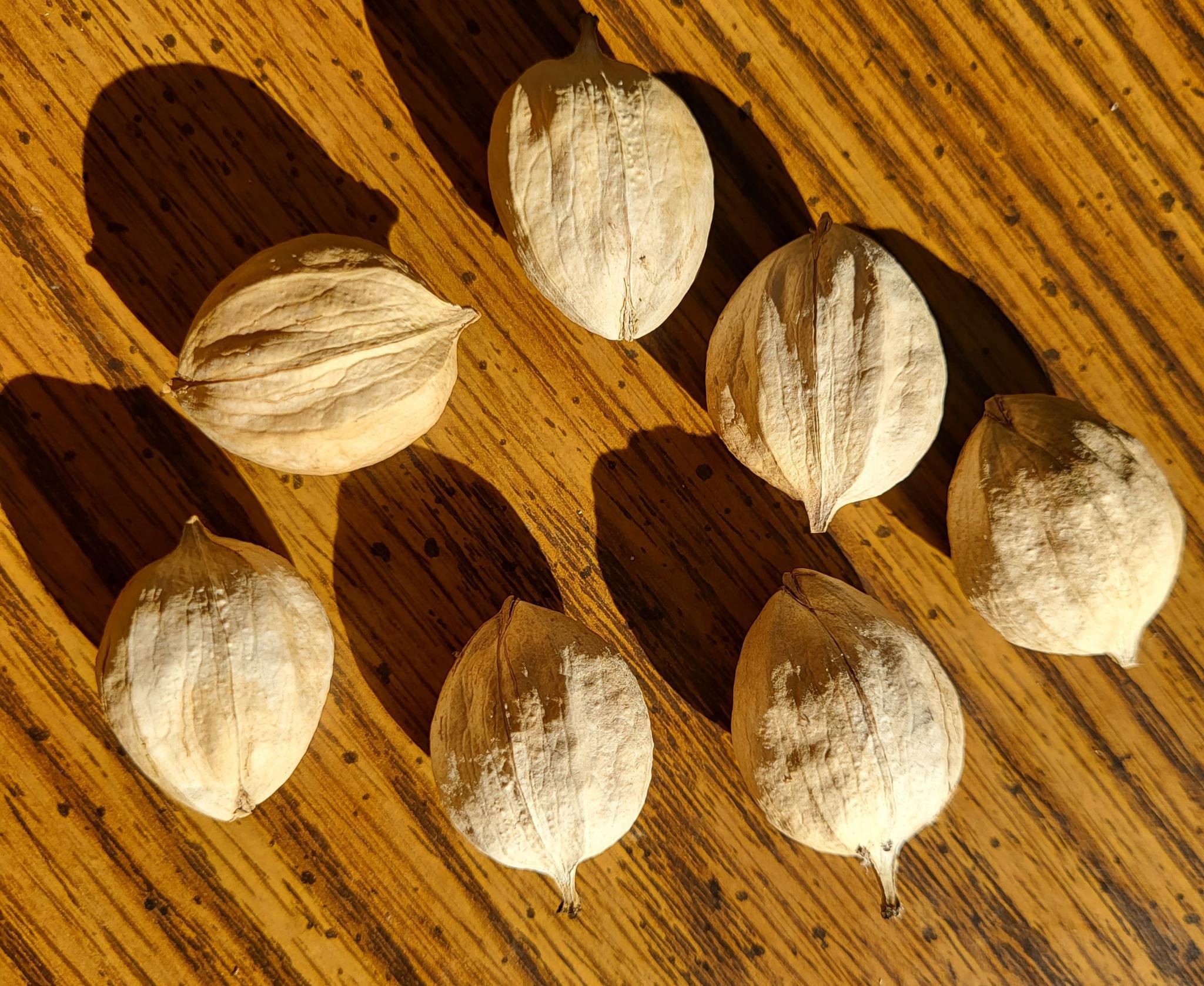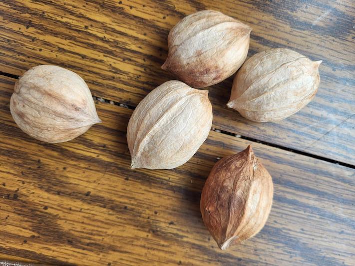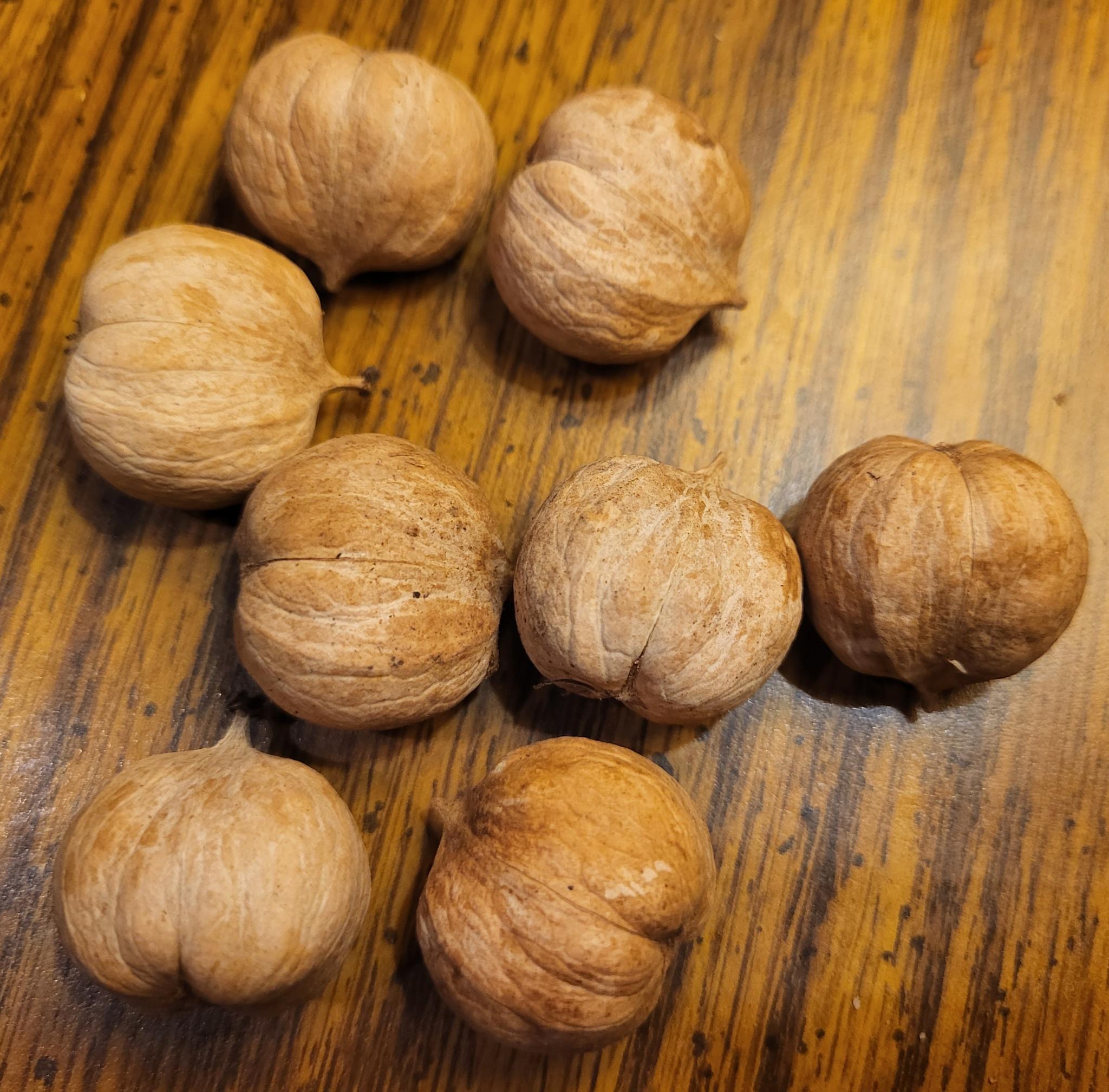 - "Paradise" - Mostly Bitternut. 3.4-4.0g kernel, 56% kernel, 20% halves, 50% quarters, 30% pieces, 70% finger extraction. Okay extraction with some shell pieces holding in large kernel pieces. 13/17 nuts were healthy in the sample provided in March. 1 had weevil, 3 were rancid. Low astringency - less than skyview. Sweet bitshag flavor like fairbanks but with astringency. Likely pollen sterile. Lateral bearing. Annual heavy bearer. Recorded yield around 200 gal in husk. PA.