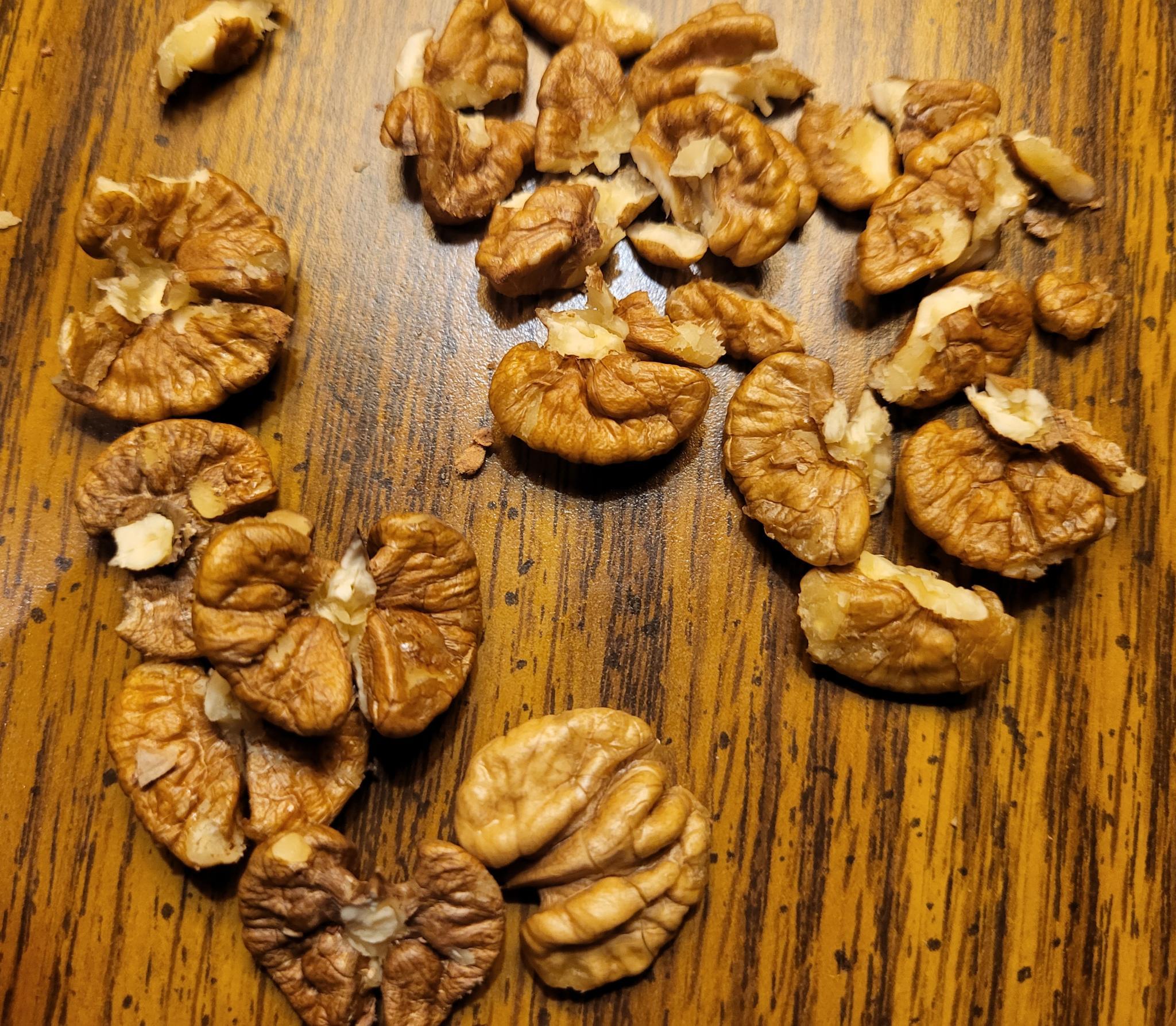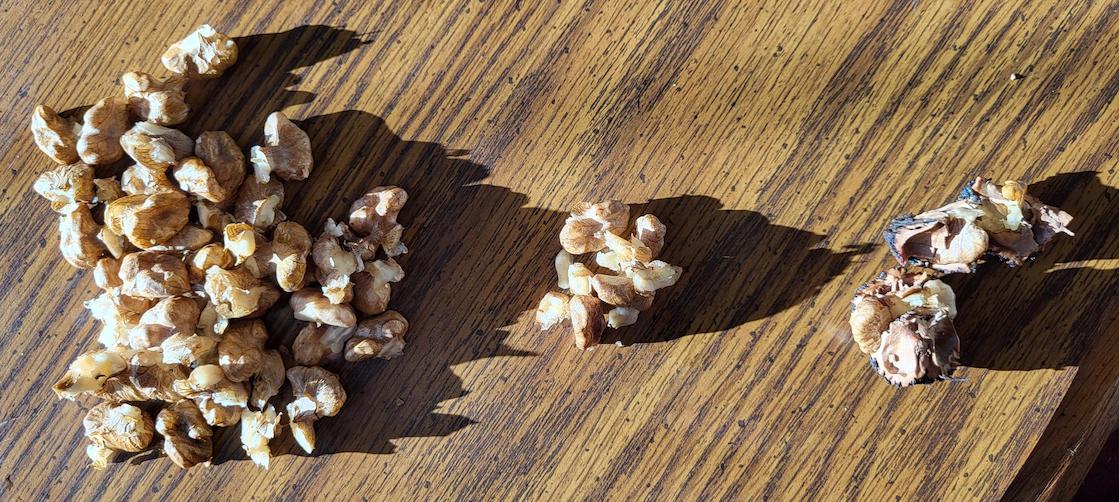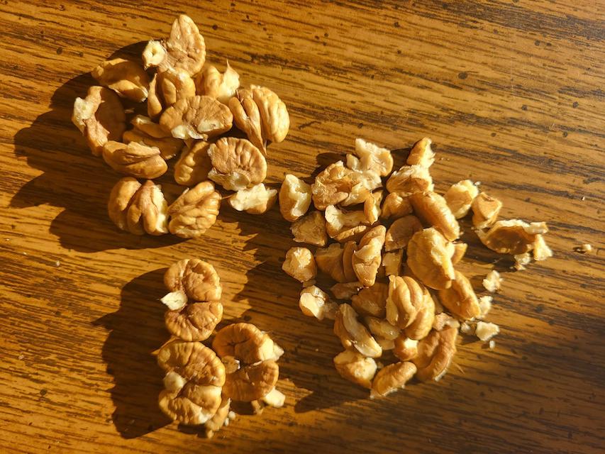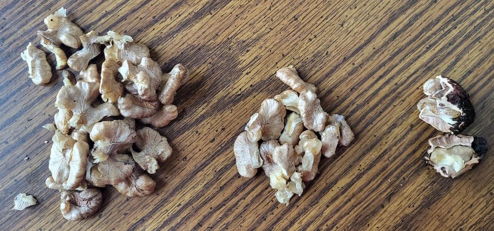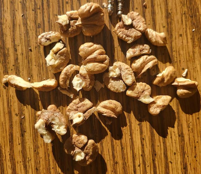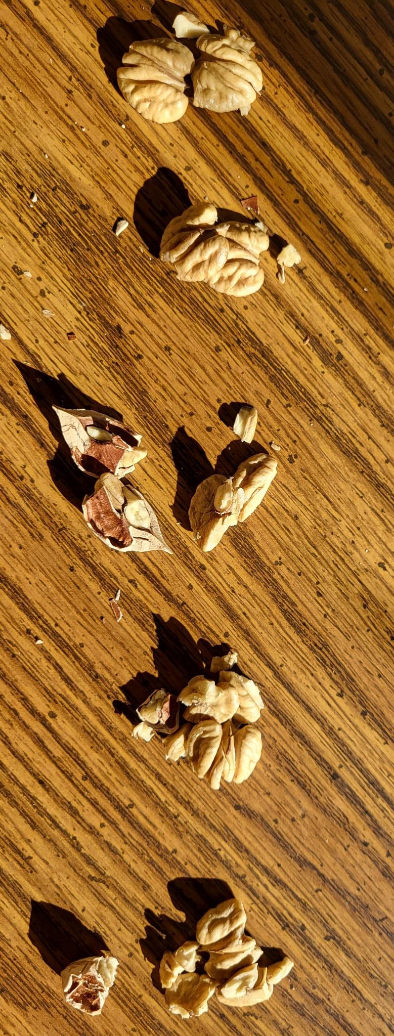 - "Grainger" - Shag. 45% kernel, 3.3-3.8g kernel. 50% halves, 40% quarters, 10% pieces. 70% easy extraction, 95% finger extraction, 5% stuck. Cracks well both directions but too pokey to crack side to side. Medium pellicle adhesion. Alternate bearing, moderate producer, Weevil resistant, Excellent shag flavor. Not recommended in my area due to poor ripening in the north and there are better selections anyways. TN native, Terre Haute, IN tested.