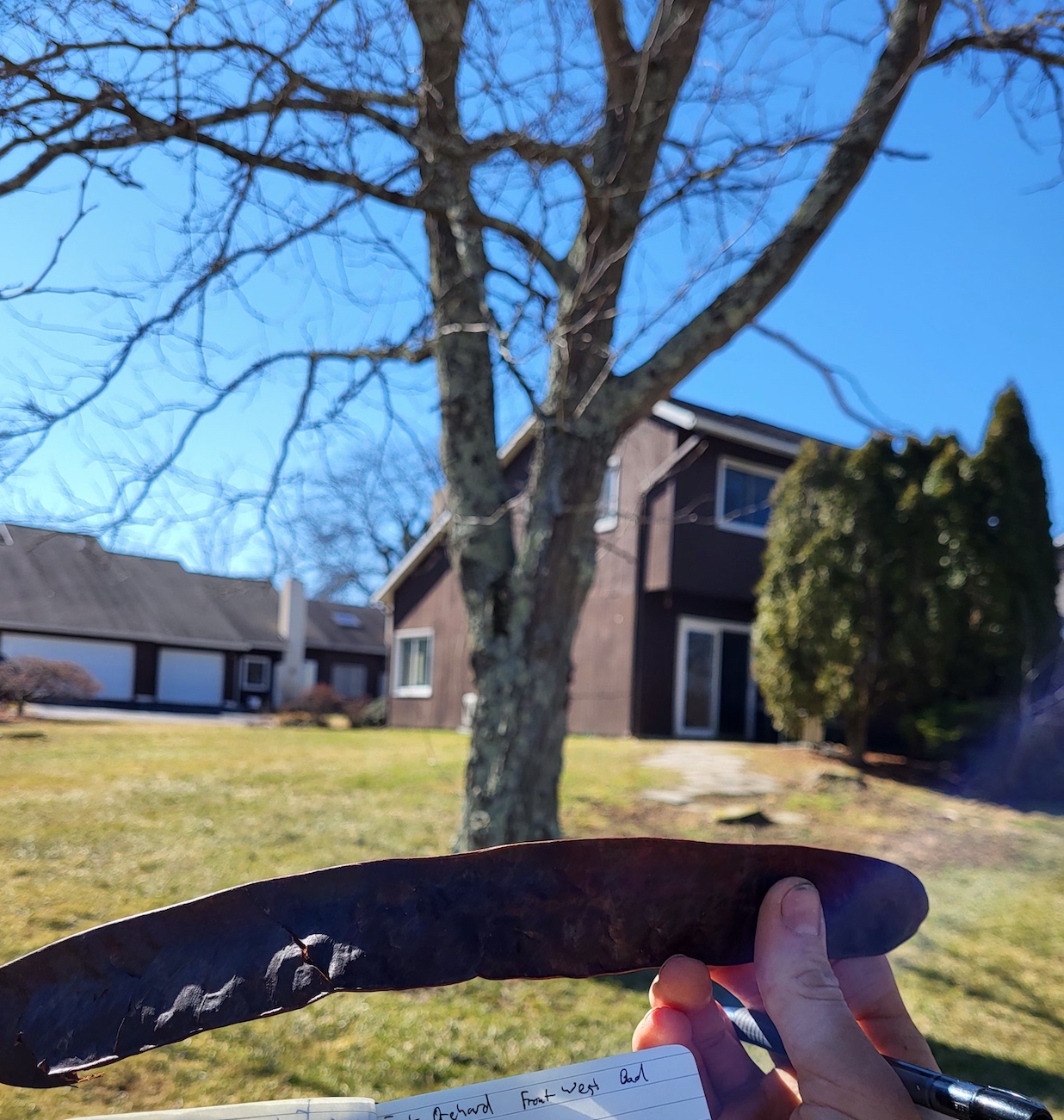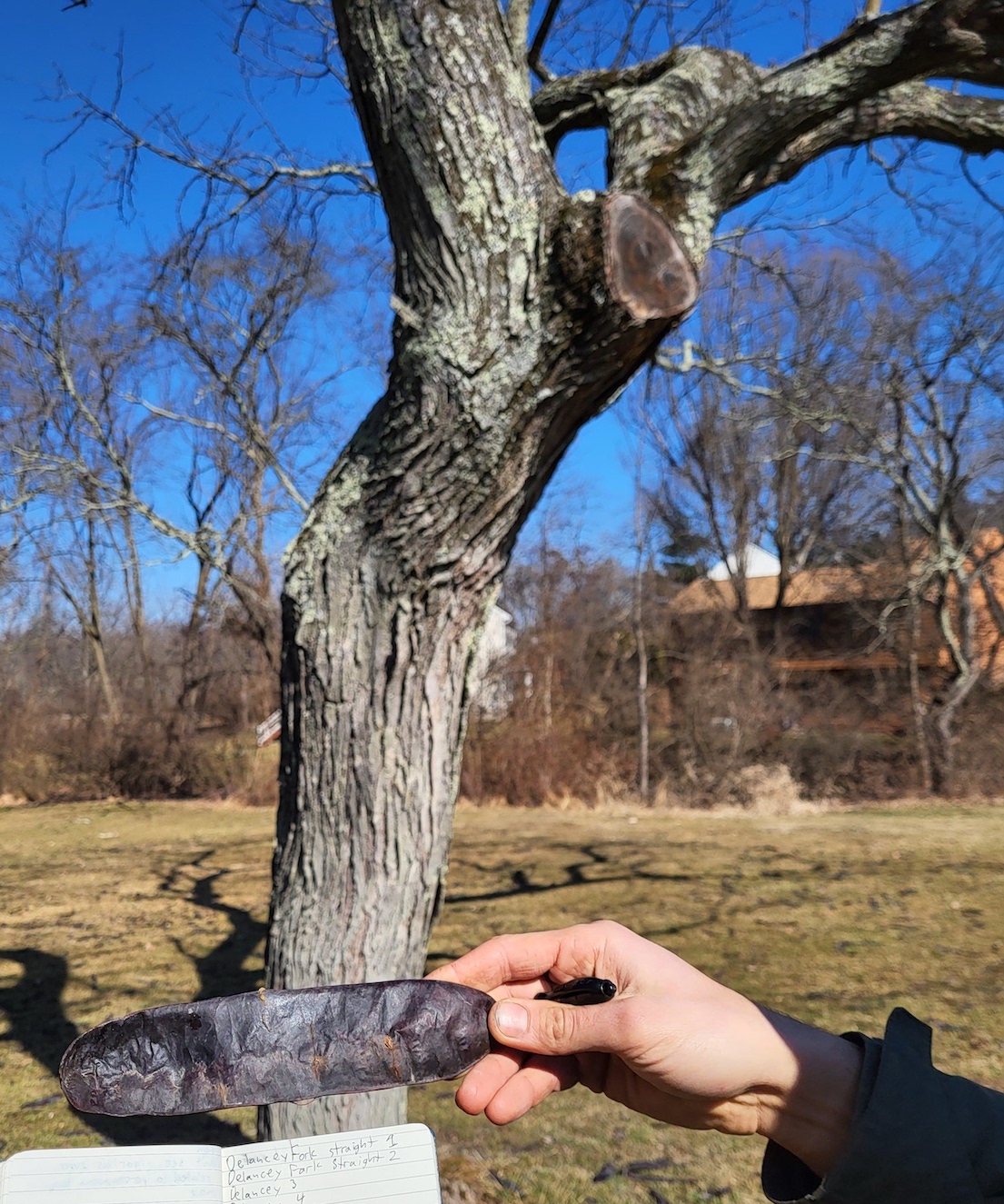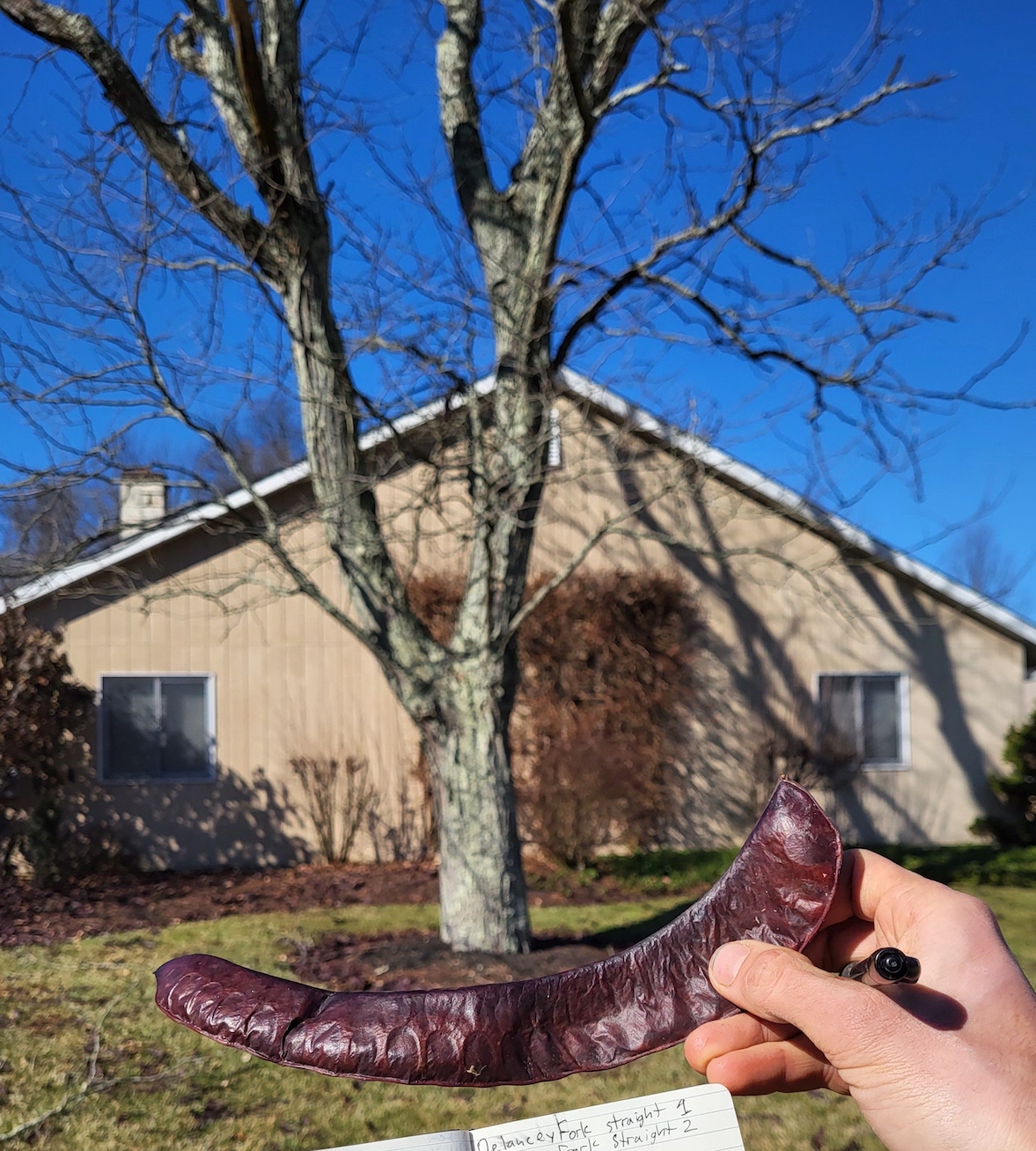 - "Long False Siers" - GlabraxShagxBit, possibly ShagxOvalisxBit. 50% kernel, 3.3-3.8g kernel, no astringency, productivity not well observed, shagbark aroma, mild black walnut flavor, late. Good extraction. 80% easy extraction, 100% finger extraction. 25% halves, 70% quarters, 5% pieces. Crack head to heel. Doesn"t always fill completely in St Croix Co in short cool years but fills to at least a 3g at 48% kernel. Low shag, somewhat tight bark with narrow plates, long narrow, pointy bud, thin wigged husk, 5 & 7 leaflets, wide leaflets, central leader form in a forest, form unknown in orchards. A seedling of False Siers. Pollen fertile. Quality breeding tree. -36F. St Croix Co WI