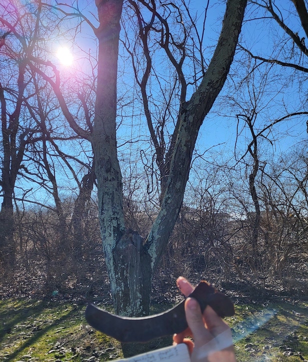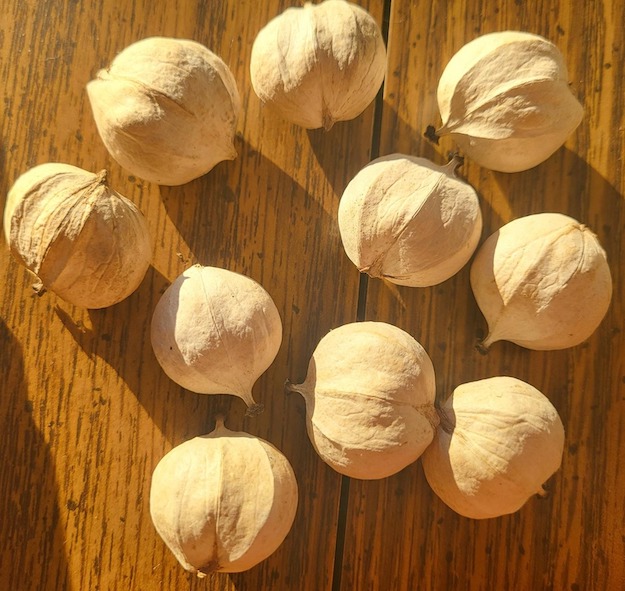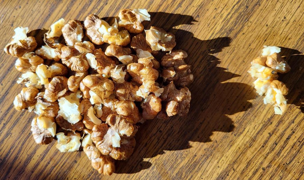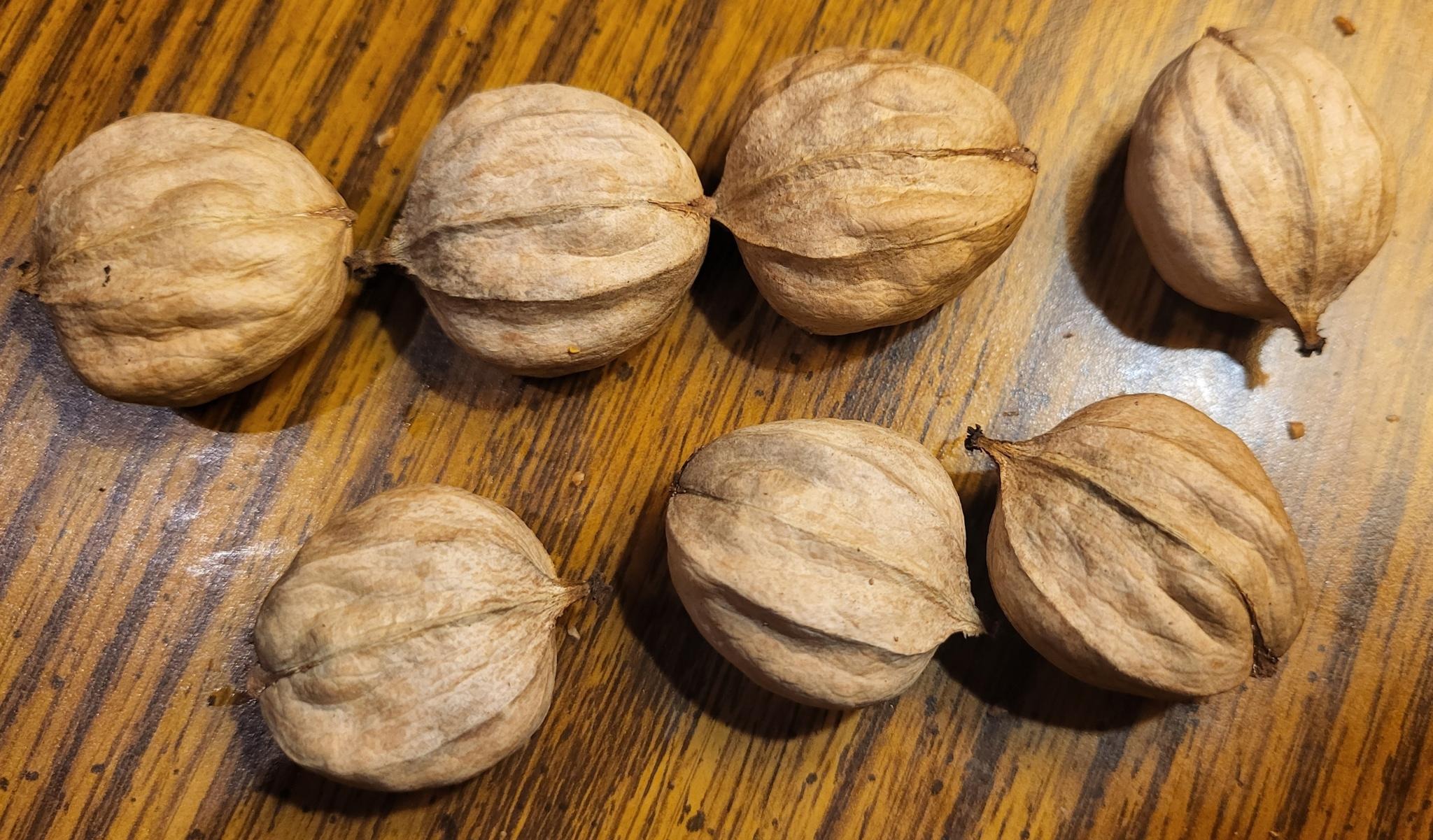 - "Skyview" - Finnicky oil-presser in KK20. Mix with high % kernel. Strong pollinator. Mostly Bitternut, some shagbark. 45% kernel, 1.9-2.4g kernel, annual heavy bearing, bland and minor astringency. 65% easy extraction. 65% quarters, 35% stuck crumbs. Requires over-cracking side to side. Ripens mid-season. Bitternut bark, shag buds, bit husk, 5 & 7 leaflets, drops in husk with husk ready for hulling. Pollen fertile. -40F. Baraboo, WI native