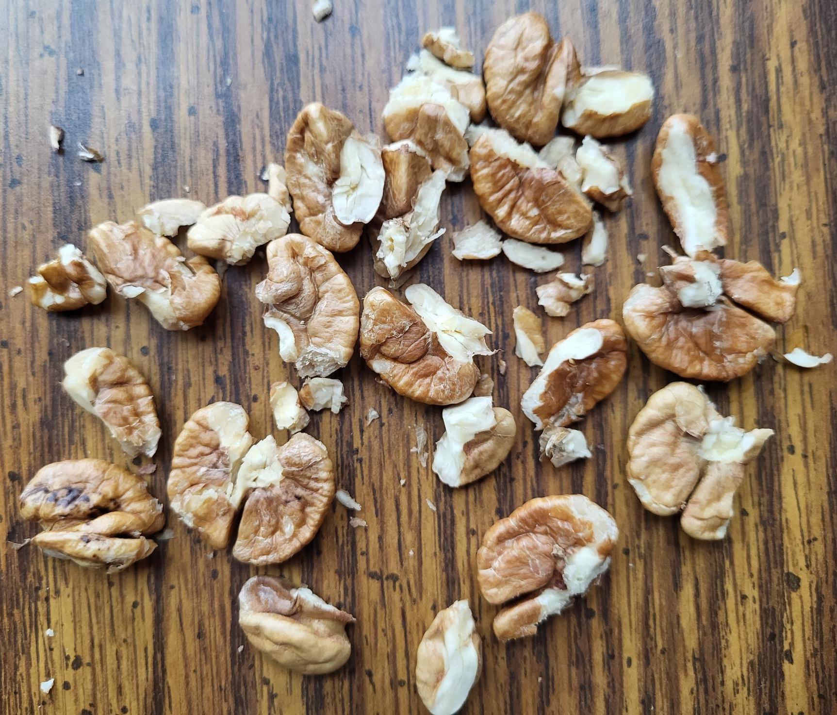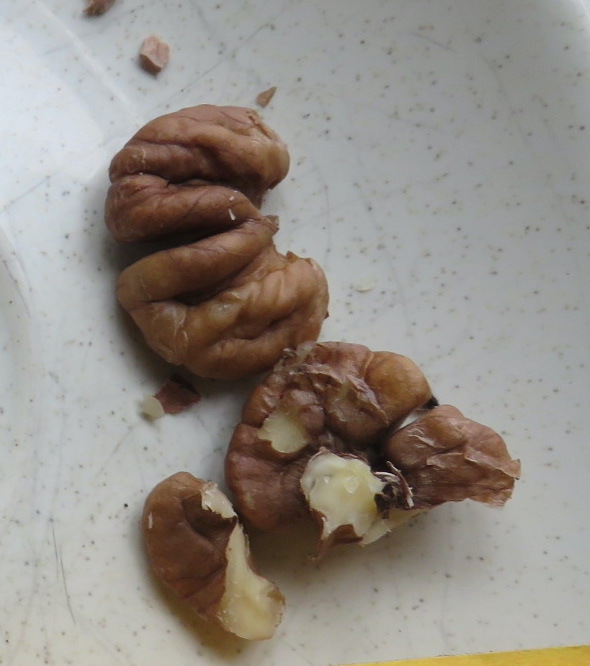 - "Lundale" - 3.4g at 43%. Filled but kernel shrinks greatly like typical of bitternuts. Very large nut with thin shell 80% quarters, 20% pieces. 80% easy extraction, 20% stuck. Fairbanks flavor. No astringency. Very weevily, not very productive.
