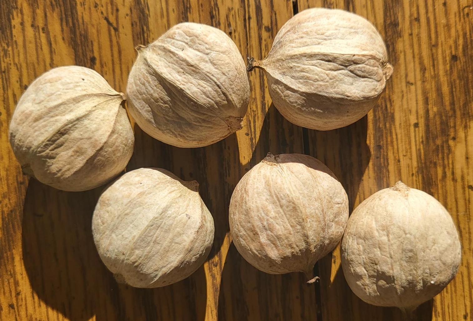 - "Sparkle" - Pollen sterile. 51% kernel, 2.0-2.5g kernel, heavy bearing, high-low alternate bearing, one of the earliest to ripen at badgersett, mild shag flavor without much depth. 75% easy extraction, 35% halves, 45% quarters, 20% pieces. Nonastringent cured but mild astringency when uncured. Fastest growing hickory and heaviest recorded single year crop at Badgersett. Sapsucker susceptible. High twig, nut, leaf, and petiole gall (Phylloxera) susceptiblity which causes major crop loss on bad years; I only recommended growing this variety if you intend on burning or grazing of leaf litter in fall reliably. This is a high input variety that should be used in mostly in breeding. Some canopy health issues due to Phylloxera. Canker resistant. Low leaf holding. Strong & spreading side branches off central leader. 30 deg crotch angles flattening towards 45 deg. Slightly wavy branches and fractally twig pattern. Typical shag type bud. Barely shagging with narrow shag plates to bark. Late receptivity. Canton, MN tested. -29F. Not yet given permission to release from Badgersett.